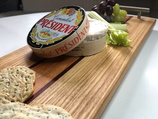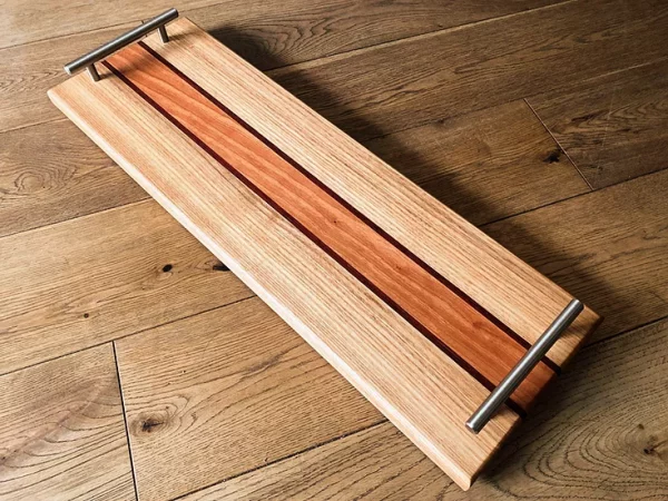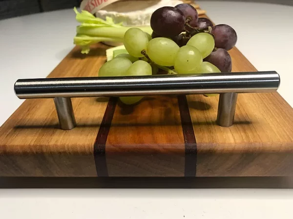 The Bantam - The third in our Charcuterie collection. This long-serving platter is handcrafted using the gorgeous colour combination of Maple, Cherry and Utile hardwoods. It is fitted with contemporary brushed nickel handles, making it more versatile for different settings. This has attractive little feet allowing smooth minimal contact on a surface. Each board will have its own individual look due to the natural colour, flecks and grain of each piece of wood we use. No two boards will be the same.